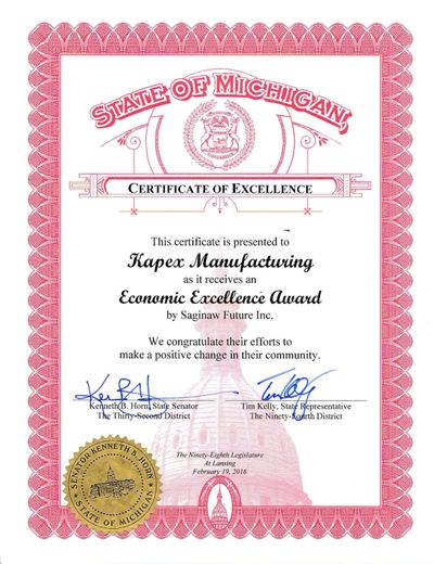 On February 19, 2016 Kapex Manufacturing received the Economic Excellence Award from the State of Michigan and presented by Saginaw Future.