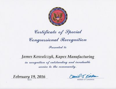 On Febuary 19, 2016 Kapex Manufacturing received the Certificate of Special Congressional Recognition because of outstanding and invaluable service to the community.