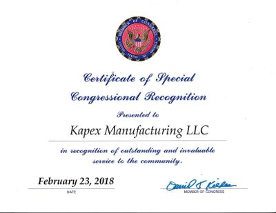 On Feb 23rd 2018 Kapex Manufacturing received a Certificate of Special Congressional Recognition in recognition of outstanding and invaluable service to the community.