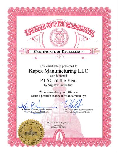 This is a certificate Kapex Manufacturing received on Feb 23rd 2018 for being the Procurement Technical Assistance Center of the Year. We received this for our work with the DOD and was given by the State of Michigan and presented by Saginaw Future.