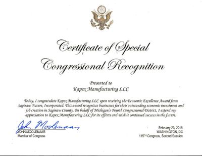 On Feb 23rd 2018 Kapex Manufacturing received another Certificate of Special Congressional Recognition. We received this for our outstanding economic investment and was presented by Saginaw Future.